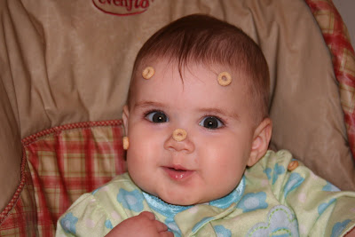 We were sitting the other night with the Missionaries and our friends the Warner's for a lesson for Tim Warner's baptism. Lewis was sitting at the table with the baby and she was fussy so I put a handful of Cheerios on her tray and Lewis started licking them and sticking them to her forehead. It was really funny but now all the kiddos think that this is a good idea. She doesn't mind too much and just eats them off her face.
